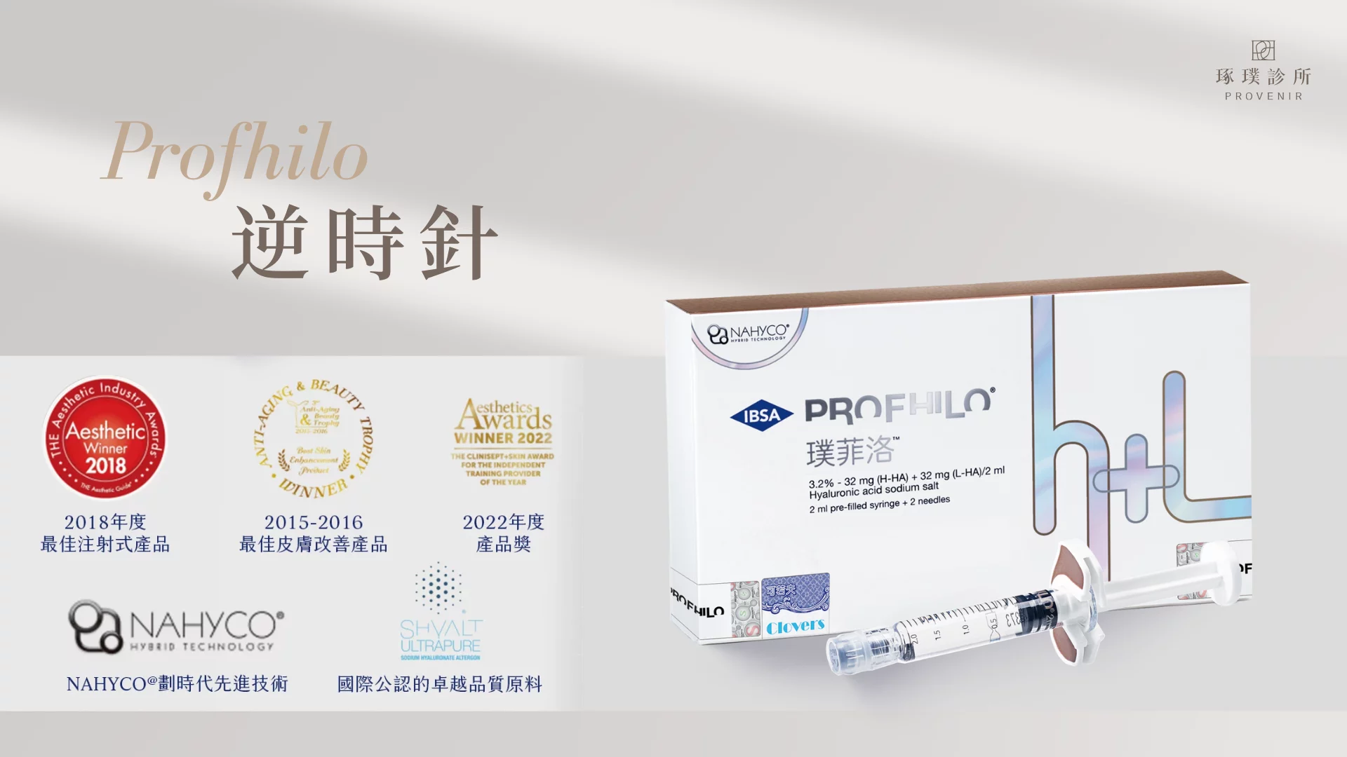 PROFHILO 逆時針 源自瑞士 IBSA 大藥廠的科研底蘊。不同於傳統填充或表層補水型療程,逆時針採用專利 NAHYCO® 透明質酸混合技術,將大、小分子玻尿酸結合,並以獨特的BAP五點注射,針對臉部與頸部肌膚深層自然擴散、均勻分布,啟動肌膚彈力蛋白再生機制,讓肌膚自然回彈、緊緻不僵硬,重塑皮膚的緊緻度與細紋。